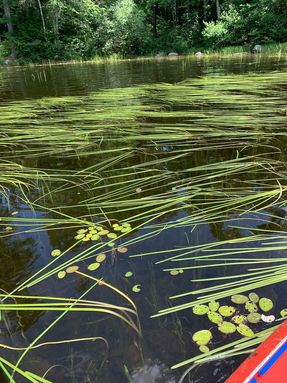 Patrolled Zone 4 on July 4, 2020. Previously went out one time in May and once in June. Plant growth this year seemed slow up until mid July - especially in the coves. All looks clear, just the usual suspects were seen: bur-reed, watershield, pickerelweed,floating heart. Water Lilies were just budding the 1st week of July. Patch of bur-reed picture taken at 3313.